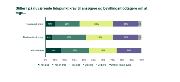 Tal fra Fondsbarometeret viser således også, at det er 14 af de 31 fonde, der i dag i høj eller nogen grad stiller krav til bevillingsmodtagere om at inddrage klimahensyn. 13 fonde stiller i høj eller nogen grad biodiversitetskrav, mens 11 fonde i høj eller nogen grad stiller krav til ansøgere og bevillingsmodtagere om at tage ressourcehensyn.