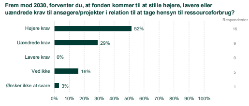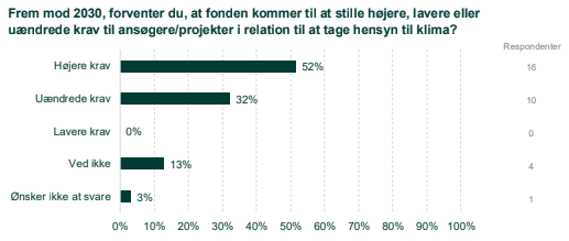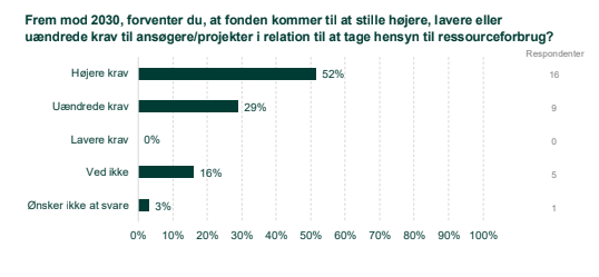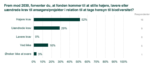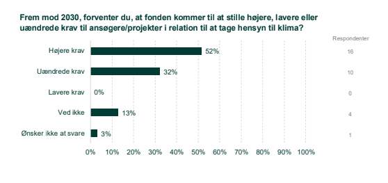 16 af de 31 fonde, der har besvaret undersøgelsen, regner med at skrue op for klima, biodiversitets- og ressourcekrav til ansøgere og projekter frem mod 2030. Yderligere 10 fonde svarer, at de grønne krav vil blive fastholdt på det nuværende niveau. Ingen af fondene regner med at lempe kravene i de kommende år. Se figur 1.
